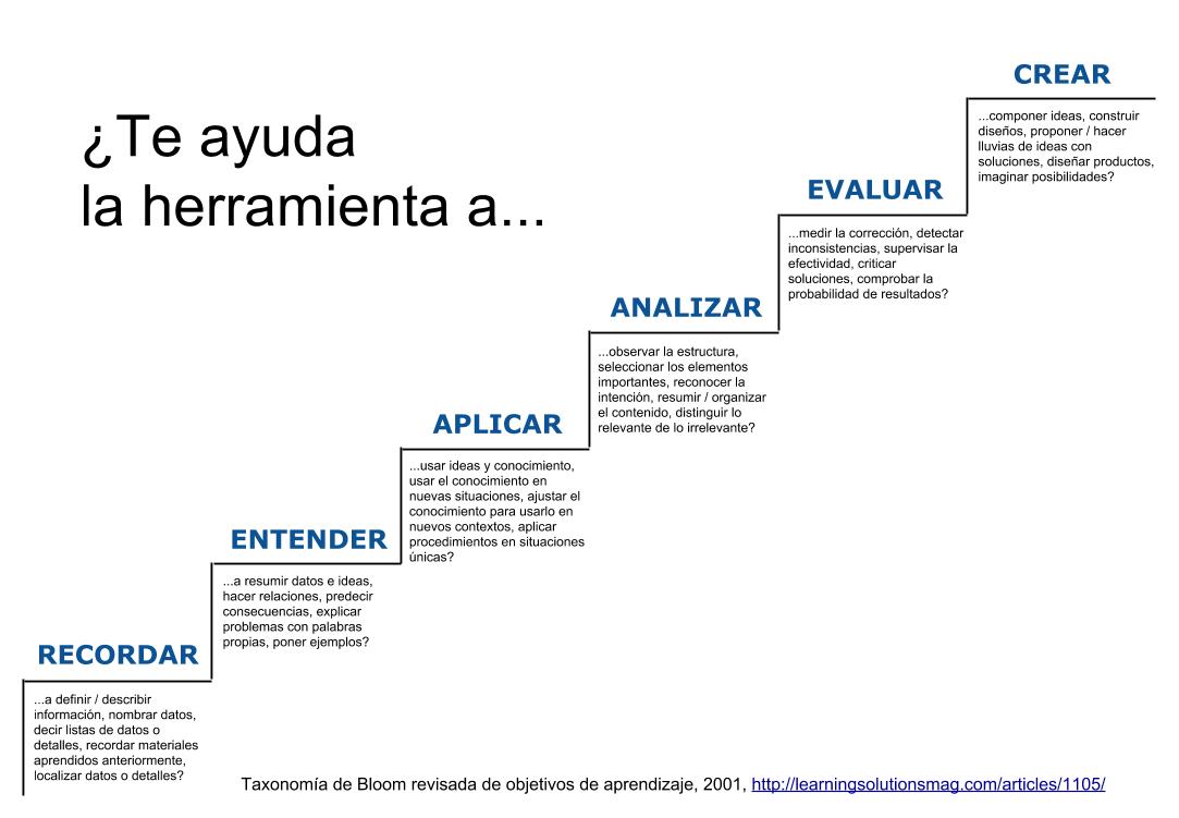 Según los distintos niveles de la taxonomía de Bloom, puedes plantearte si la herramienta ayuda al usuario a recordar, entender, aplicar, analizar, evaluar o crear. Las preguntas que hay en el gráfico pueden serte de ayuda.